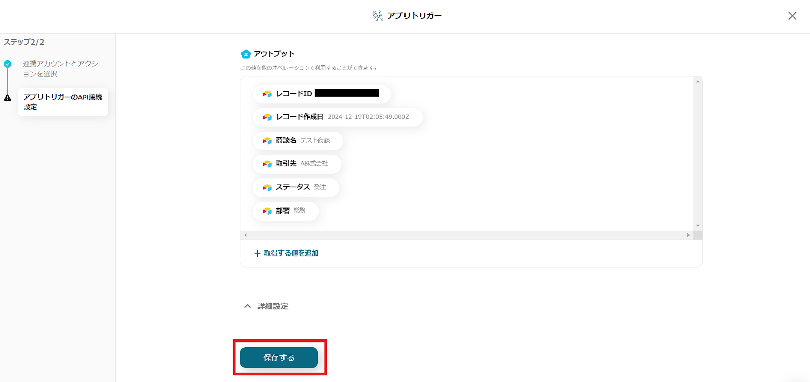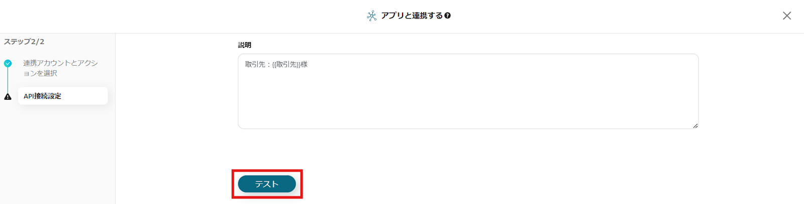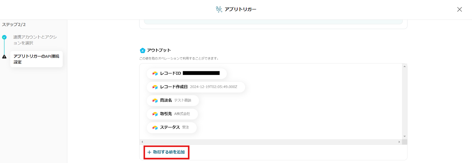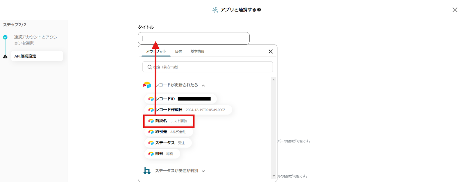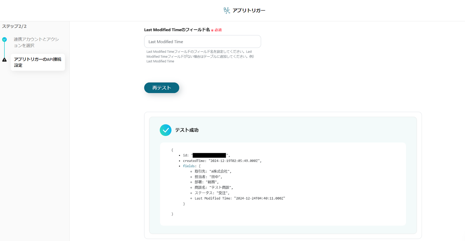 画像のように青く「テスト成功」と表示が出たら、Trelloに反映したいAirtableのデータをJSONPATHでアウトプットとして取得します。