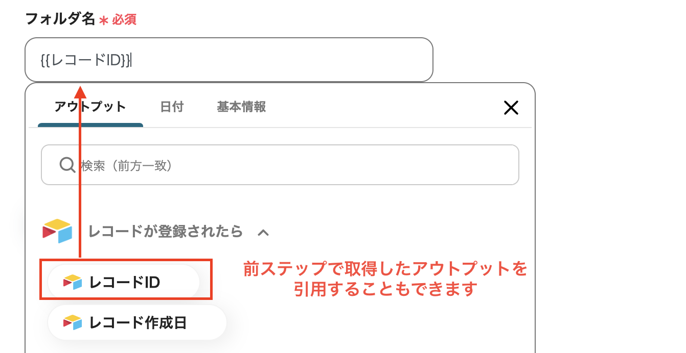 なお、前ステップでも記載したように、取得できるアウトプットを増やしたい場合、JSONPathで他の値(例:取引先(会社名))も取得しておくと、「フォルダ名」を設定する際に、【例:{{会社名}}様】というように設定できます。