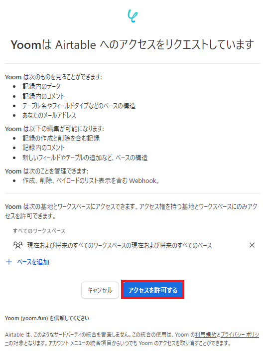 「ベースを追加」をクリックし、今回使用するベースを選択してください。