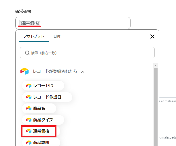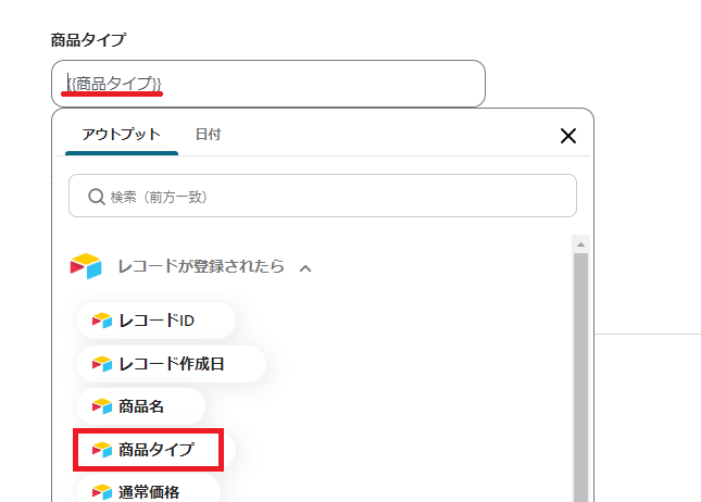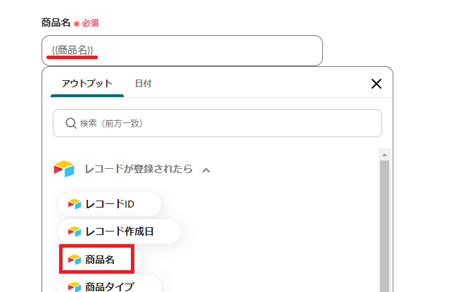 ※設定方法)枠内をクリックし「レコードが登録されたら」の中にある「商品名」をクリックしてください。{{商品名}}と入力されます。