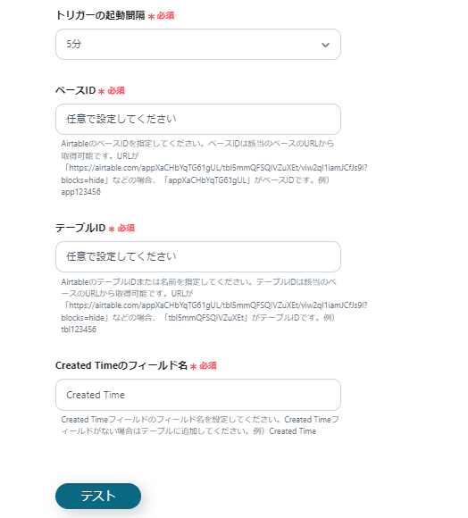 ベースID・テーブルID・Created Timeのフィールド名は、画面の注釈を参考に入力してください。