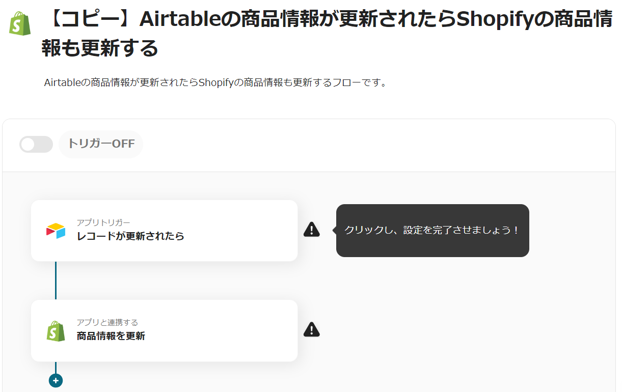 今回は「Airtableの商品情報が更新されたらShopifyの商品情報も更新する」という以下のテンプレートの設定方法をご紹介します。
