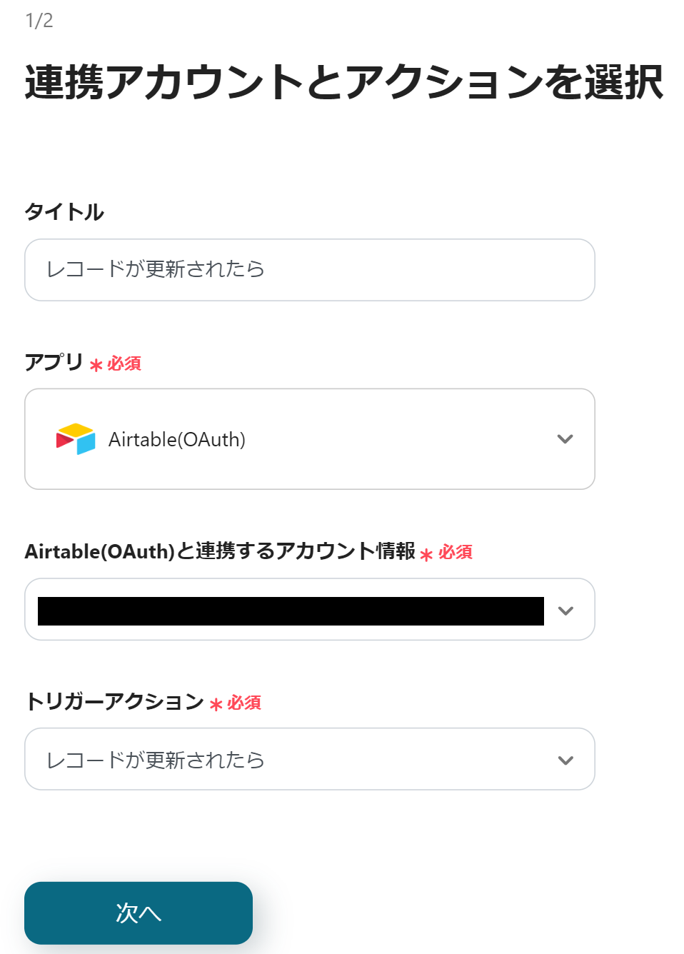 最初にAirtableの設定を行うため、「レコードが更新されたら」をクリックしましょう。