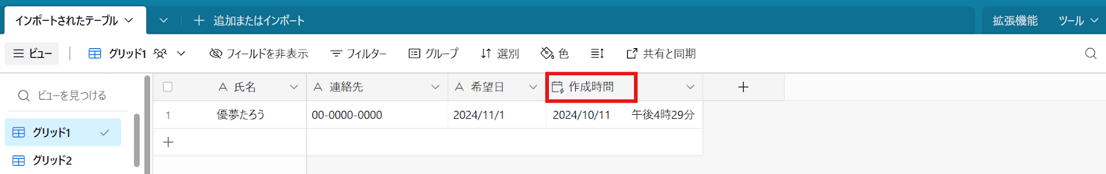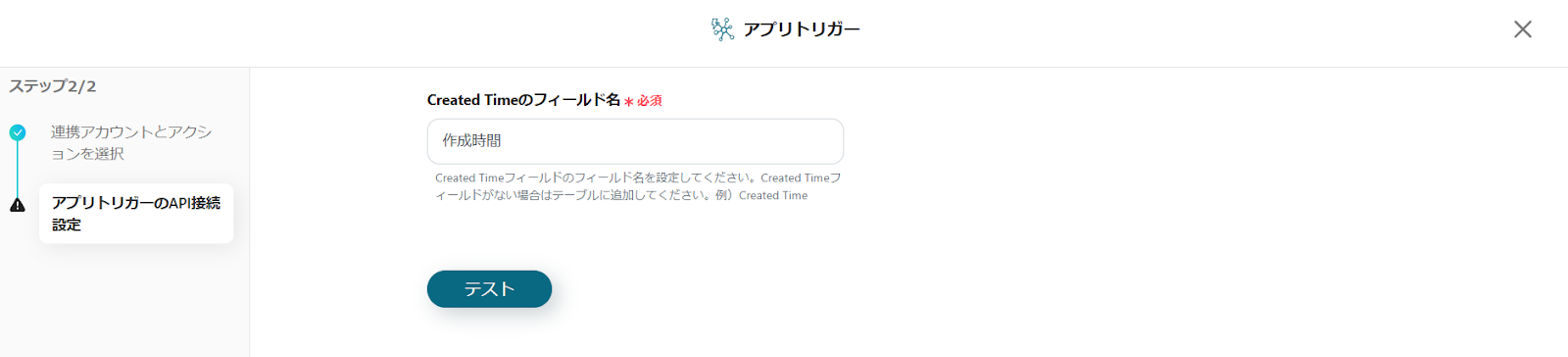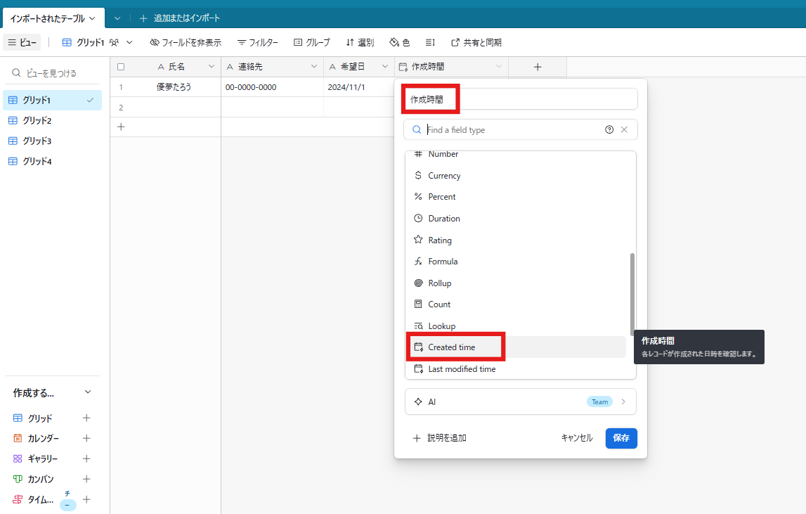 この際、必ず・Created Time(作成時間)のフィールドを作成しましょう。