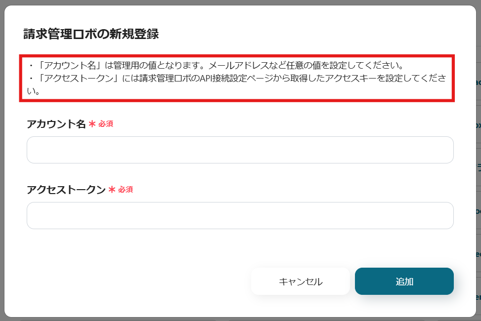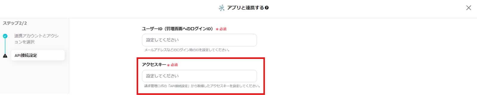 次にアクセスキーに関しては、マイアプリ連携の際に使用したアクセストークンを入力してください。