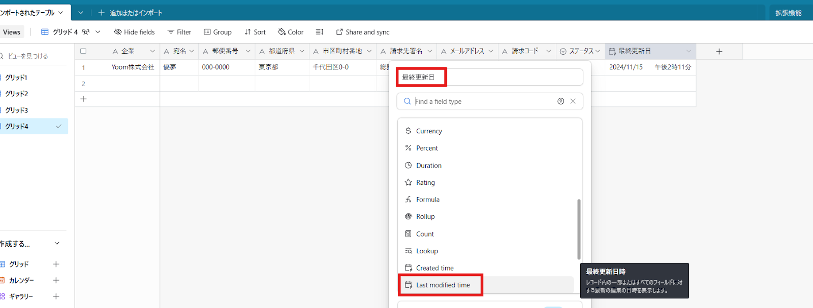 次に、Last Modified Timeは、「最終更新日」としてフィールドを作成しましょう。