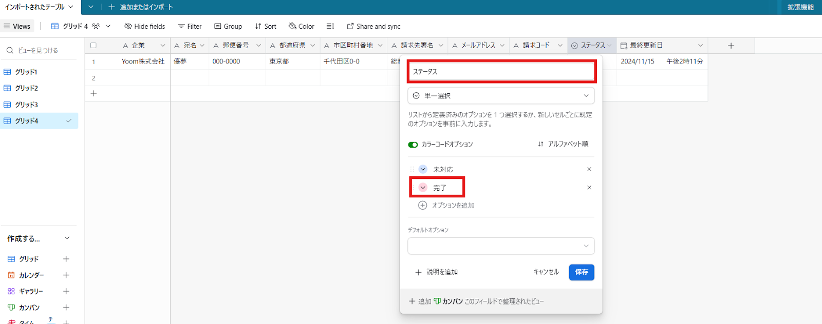 今回は赤枠部分のとおり、ステータスが完了になると請求管理ロボにデータが登録される設定になっています。
