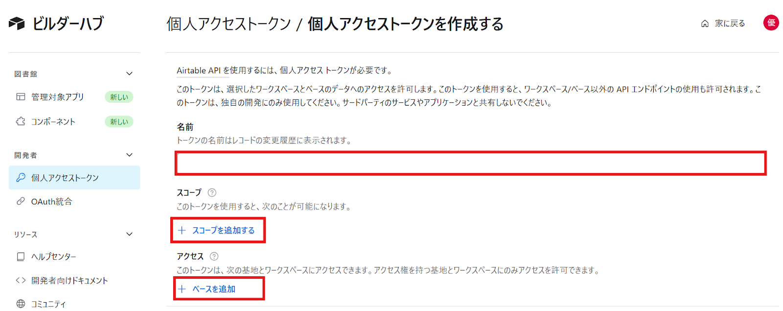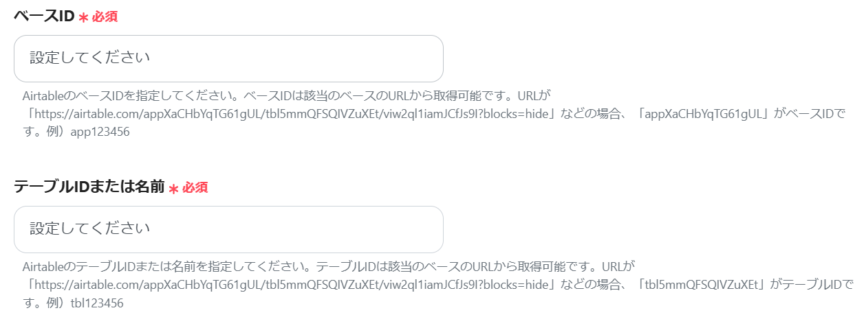 スクロールして「ベースID」と「テーブルIDまたは名前」をURLから選択しましょう。