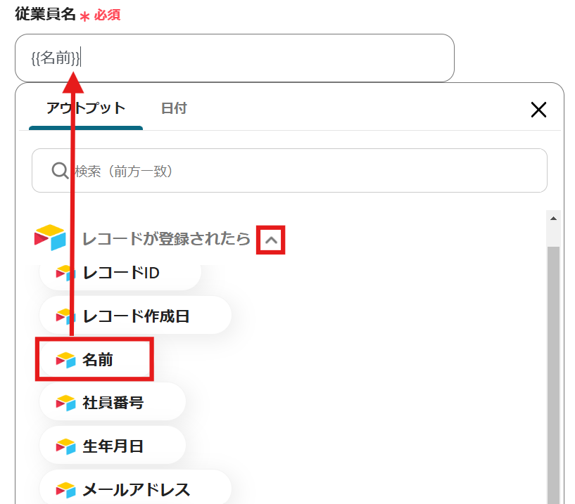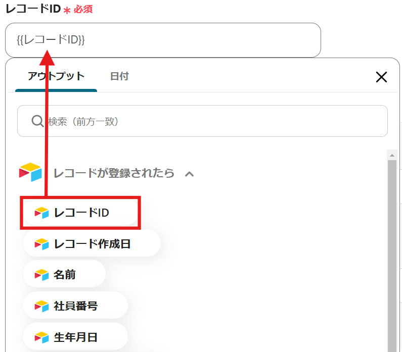 先ほど設定したAirtableのアウトプットを使用して設定してください。