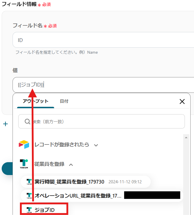 こちらのフィールド情報を取得する方法を参照し、アウトプットを設定しましょう。