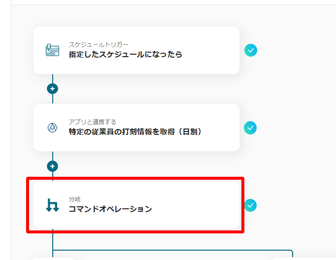 「特定の従業員の打刻情報を取得」の設定で取得した「打刻回数」のアウトプットが分岐の条件になっています。
