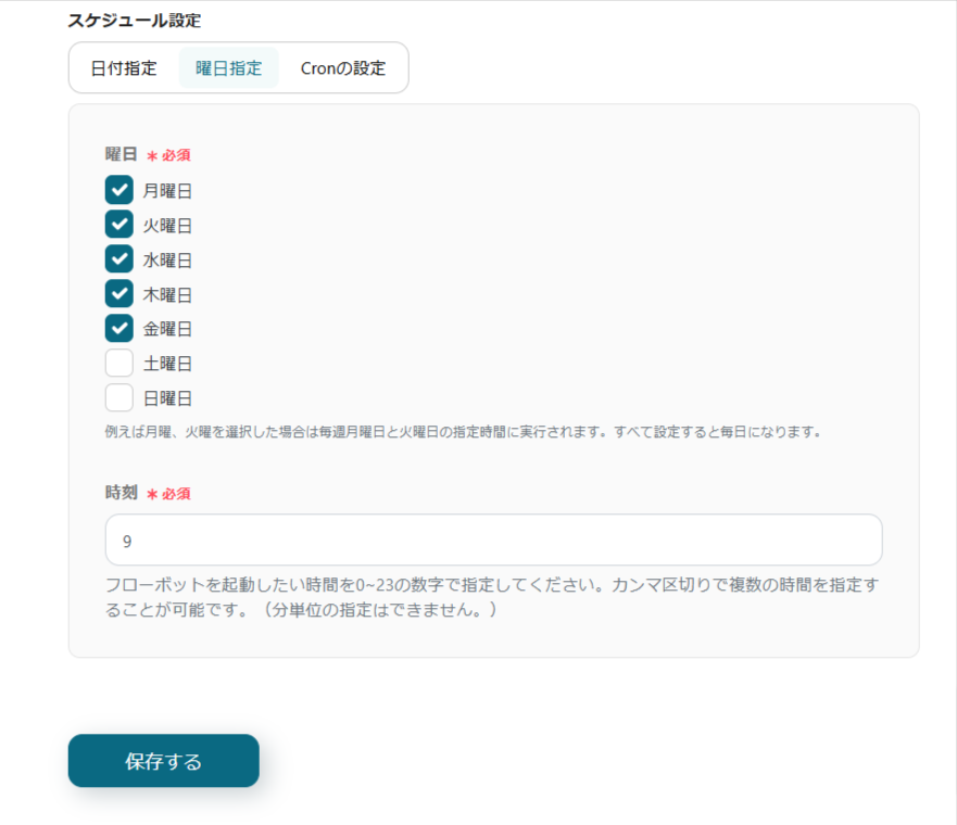 上記画像の設定であれば、平日の毎朝9時にフローボットが起動するようになっています。
