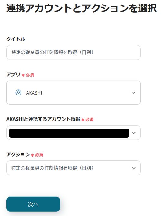 1ページ目では、AKASHI同様にアカウント情報の確認とタイトルの修正を行って次に進んでください。