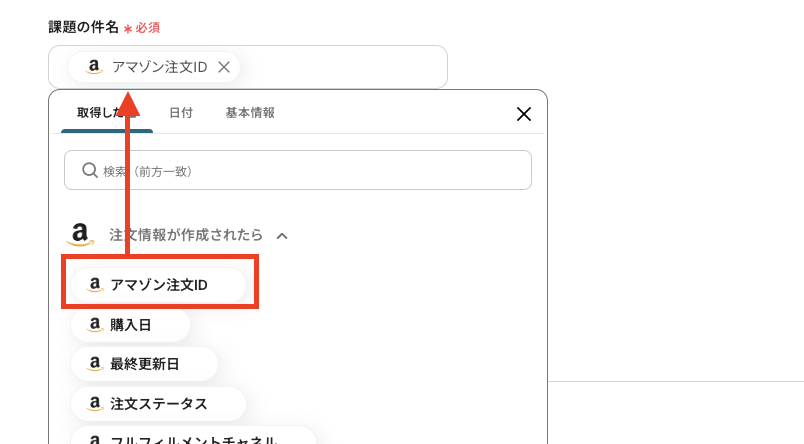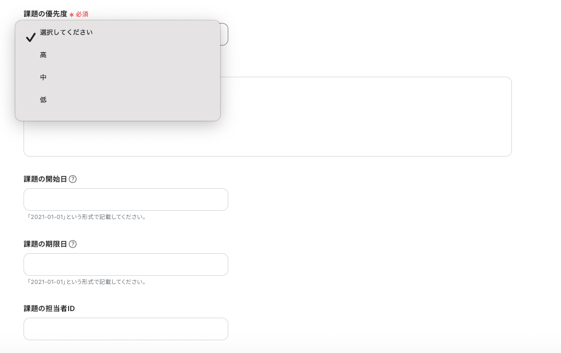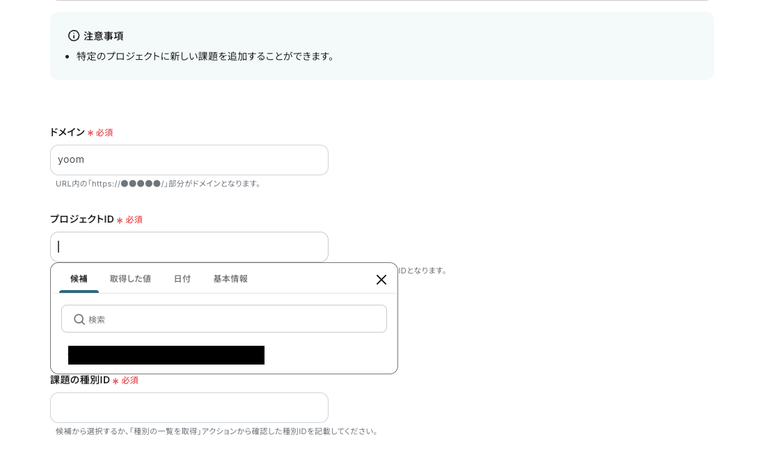 「課題の件名」などは、前ステップから取得したアウトプットを引用・設定できます。