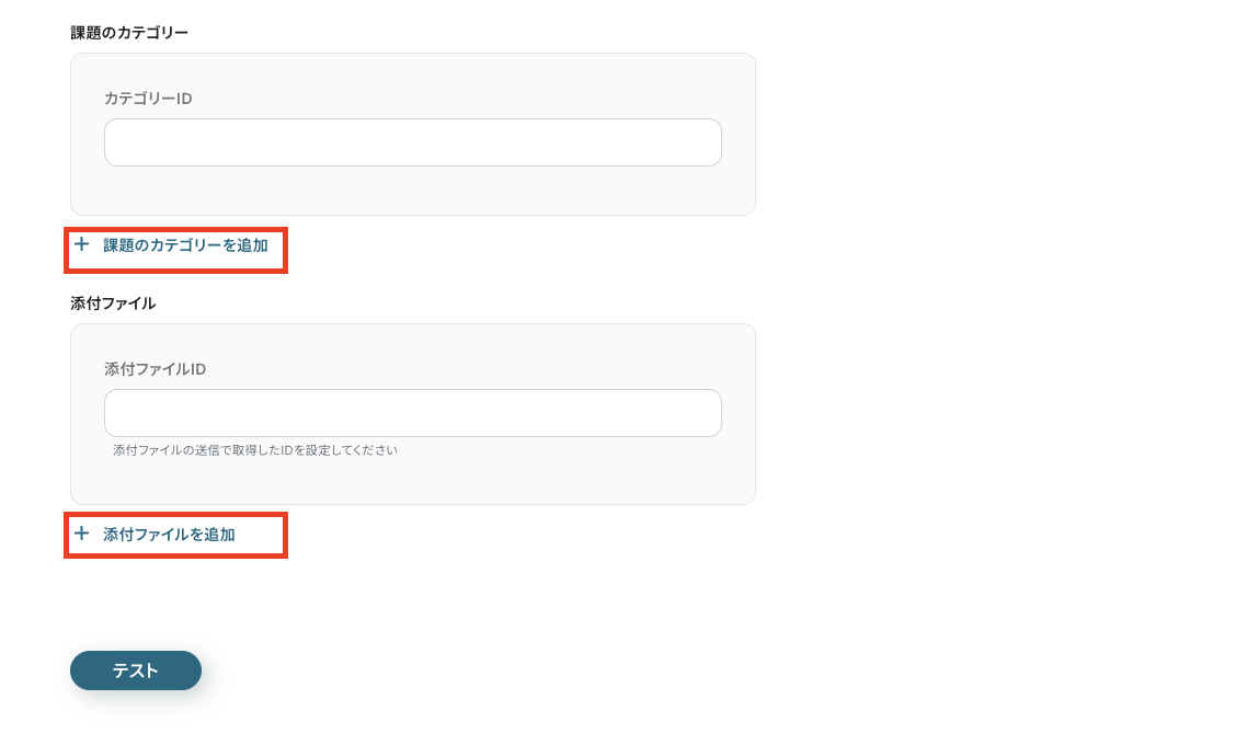 課題のカテゴリーや添付ファイルは、赤枠部分をクリックすることで設定できる項目を増やすことが可能です。