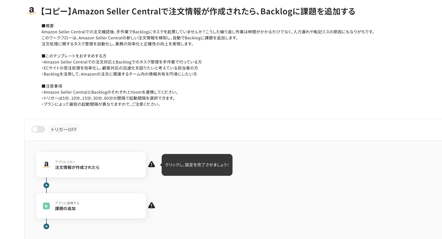 このワークフローを活用すれば、Amazon Seller Centralで特定の注文情報が作成されたタイミングをきっかけに、自動でBacklogに課題を追加できます。