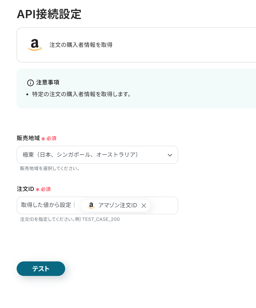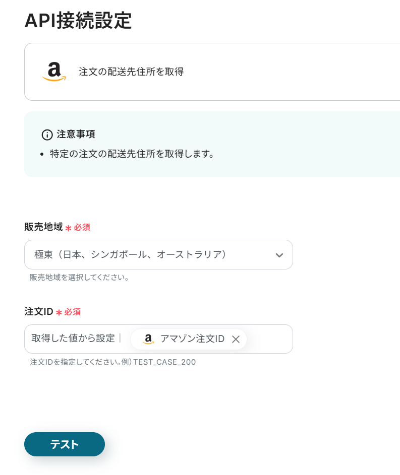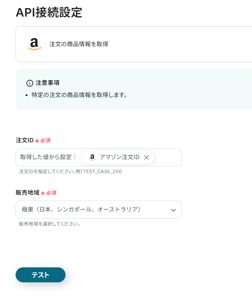 前項と同様に販売地域と注文IDを選択します。 全て入力したら「テスト」を実行し「保存」してください。