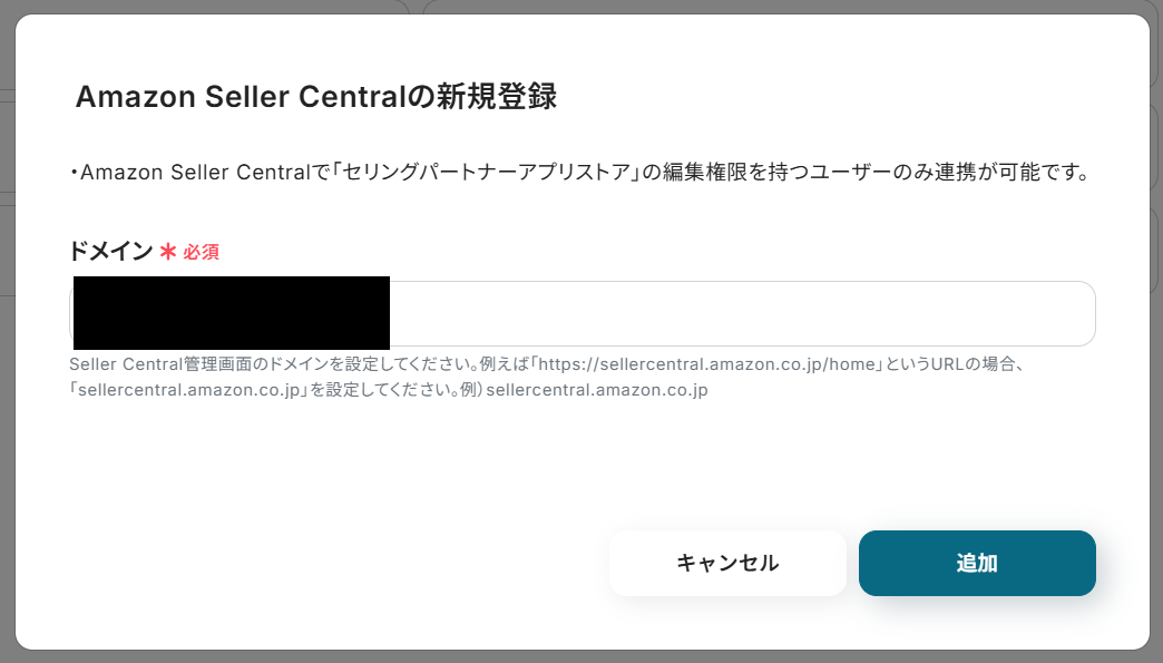 こちらの画面でAmazon Seller Centralの管理画面のドメインを入力し「追加」をクリックします。