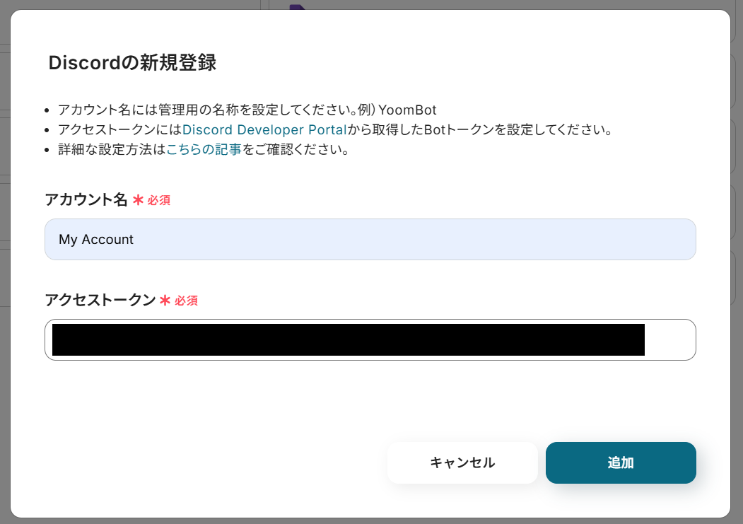 こちらの画面で任意のアカウント名と注釈に従ってアクセストークンを取得し入力したら、「追加」をクリックしてください。