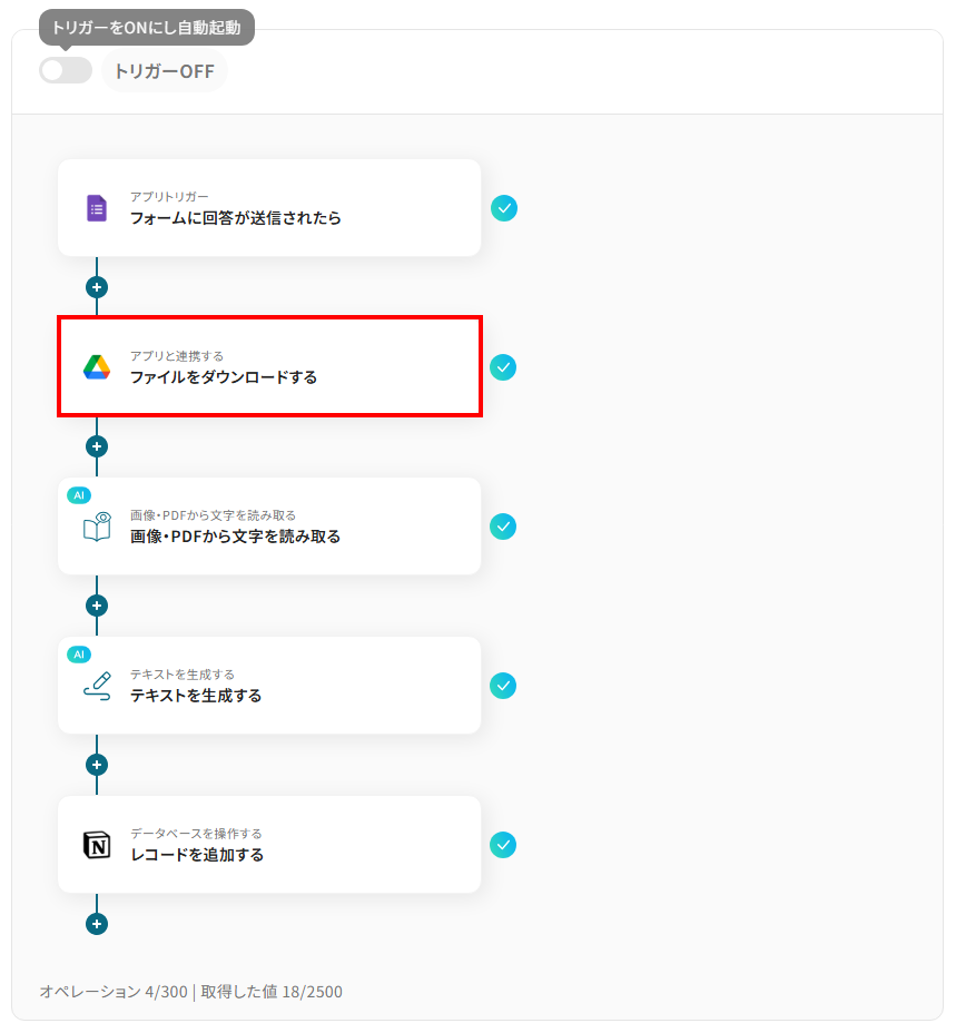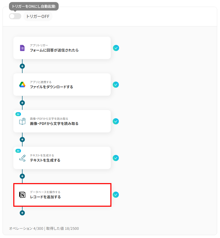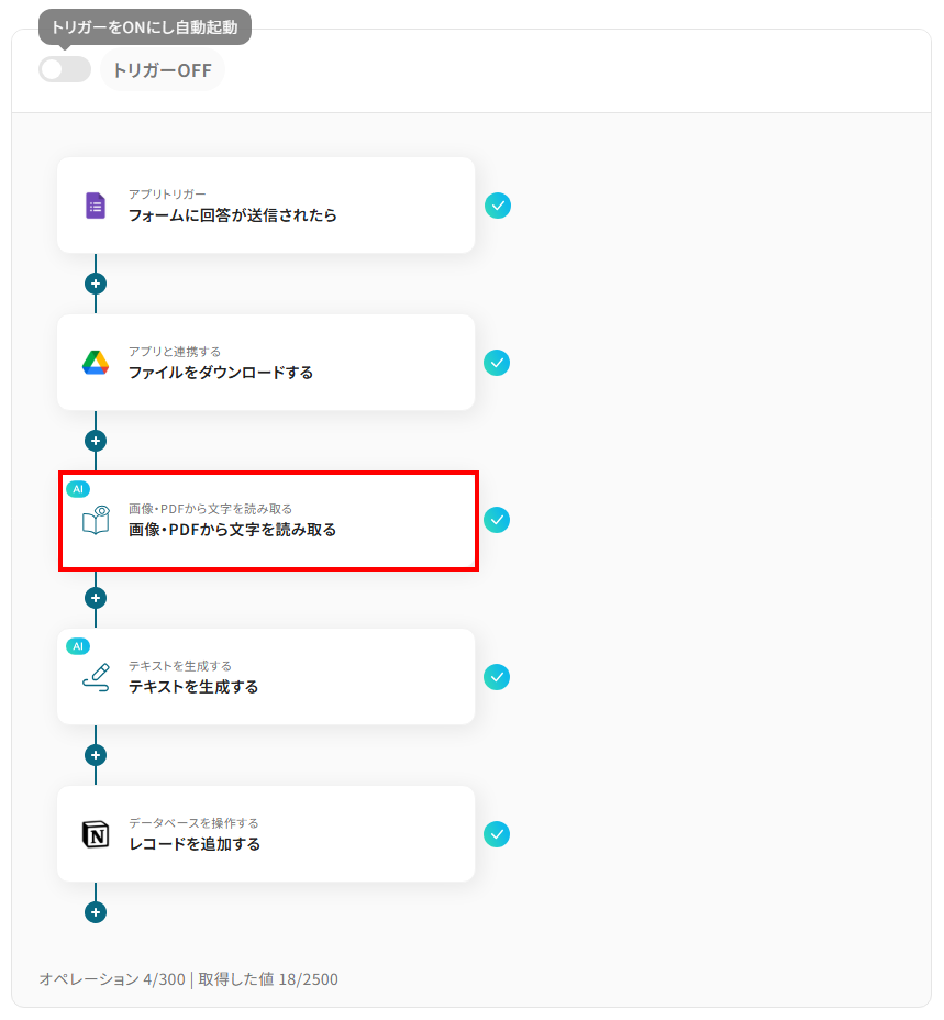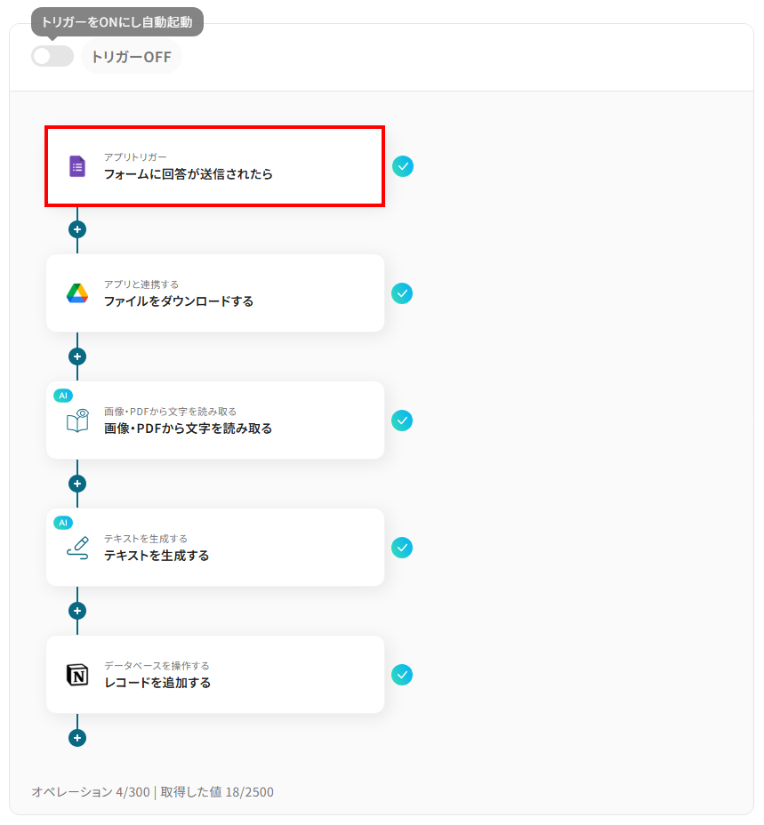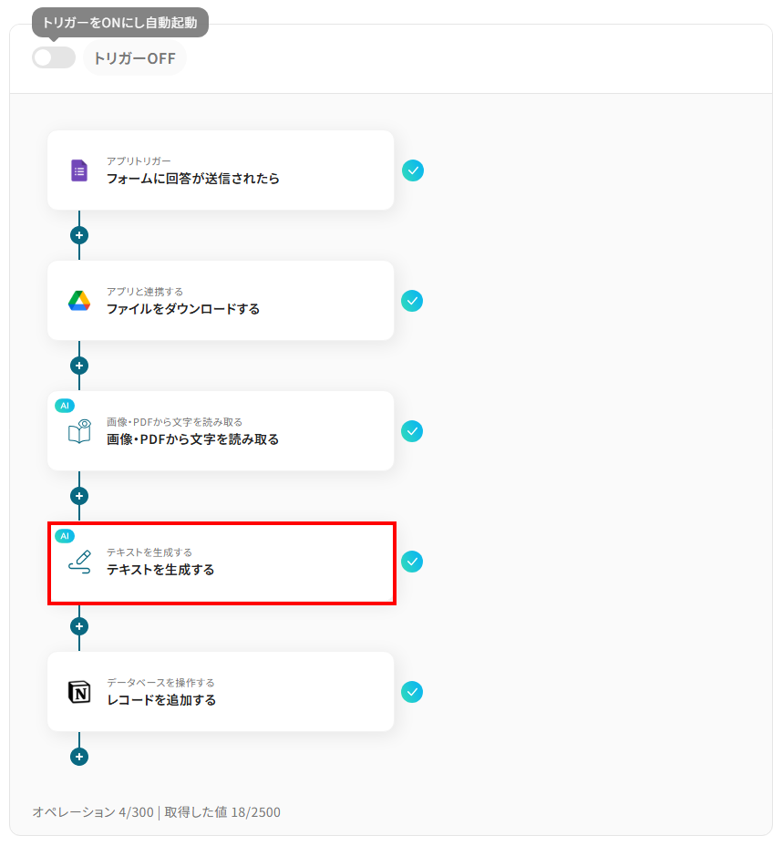 - Googleフォームのトリガー設定、AIによる文字読み取り設定とテキスト生成設定、Notionのアクション設定