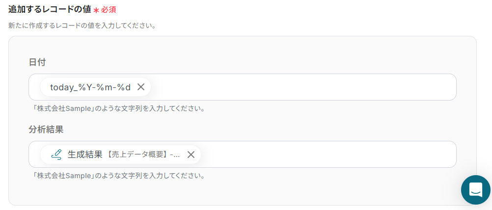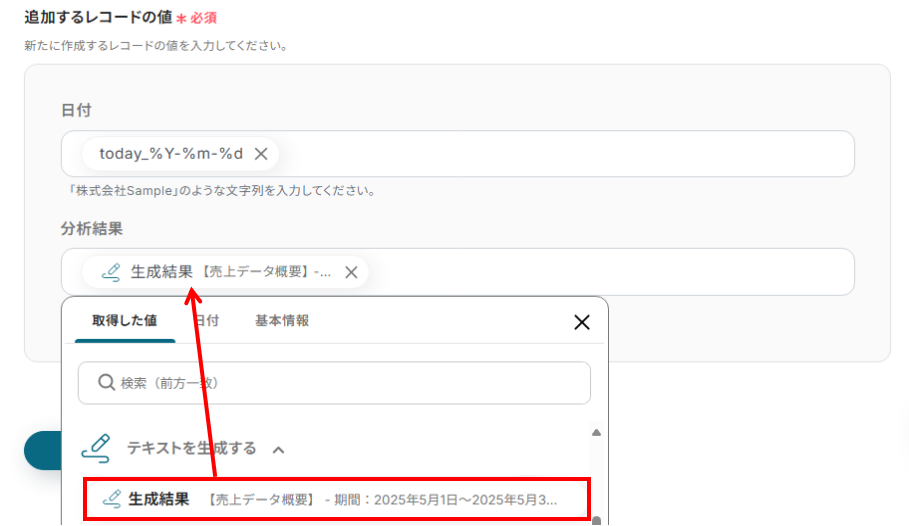 今回は、下記のように生成したテキストと今日の日付を追加するよう設定しました。