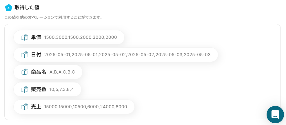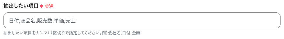 - 追加で抽出したい項目:対象のファイルから抽出したい項目を入力しましょう。複数ある場合はカンマ区切りで指定してください。今回は、下記のように抽出したい項目を設定しました。