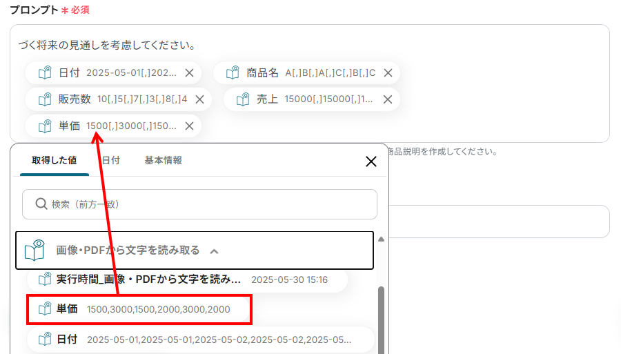 プロンプト欄をクリックすると、下記のようなアウトプットが表示されるので、先ほど抽出したテキストを選択しましょう。