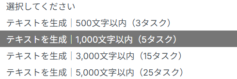 アクションは、デフォルトで「テキストを生成|500文字以内(3タスク)」が選択されています。先ほどと同様に、文字数と消費タスク量に注意して任意で変更してください。