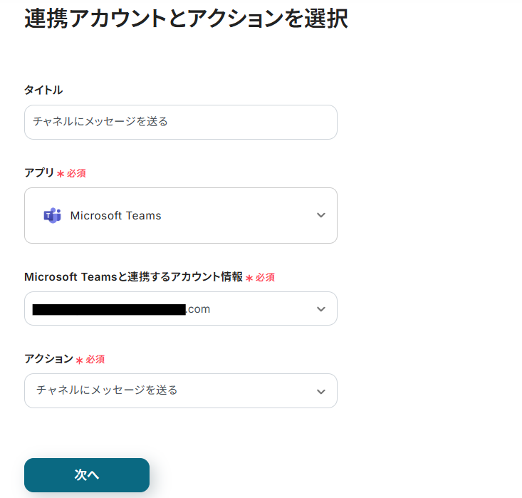 連携アカウントとアクションを選択する画面が表示されるので、今回連携するMicrosoft Teamsのアカウントを確認し「次へ」をクリックします。