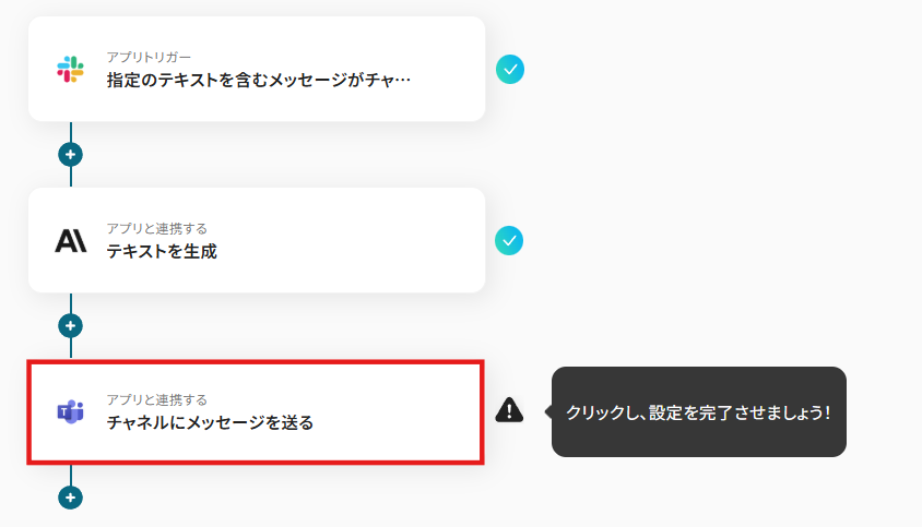 もし、Anthropic(Claude)での処理結果を自動的にMicrosoft Teamsの指定したチャンネルに通知する仕組みがあれば、こうした定型的な情報共有作業から解放され、チーム全体の情報共有もスムーズになります。