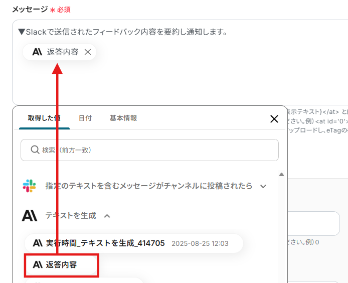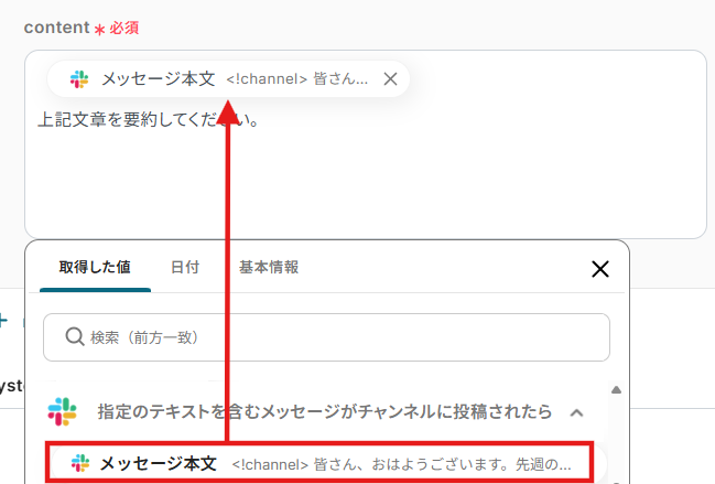 なお、テキストを直接入力した部分は固定値とされるため、下記画像のように「上記を要約してください。」などは手入力し、毎回変動することが望ましい「メッセージ本文」はアウトプットを活用しましょう。