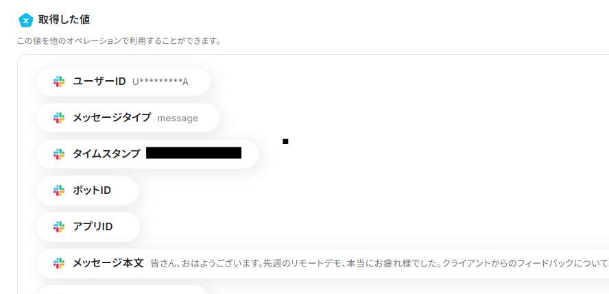 contentにはSlackから取得した値=先ほど取得したアウトプットを以下のように入力しましょう。