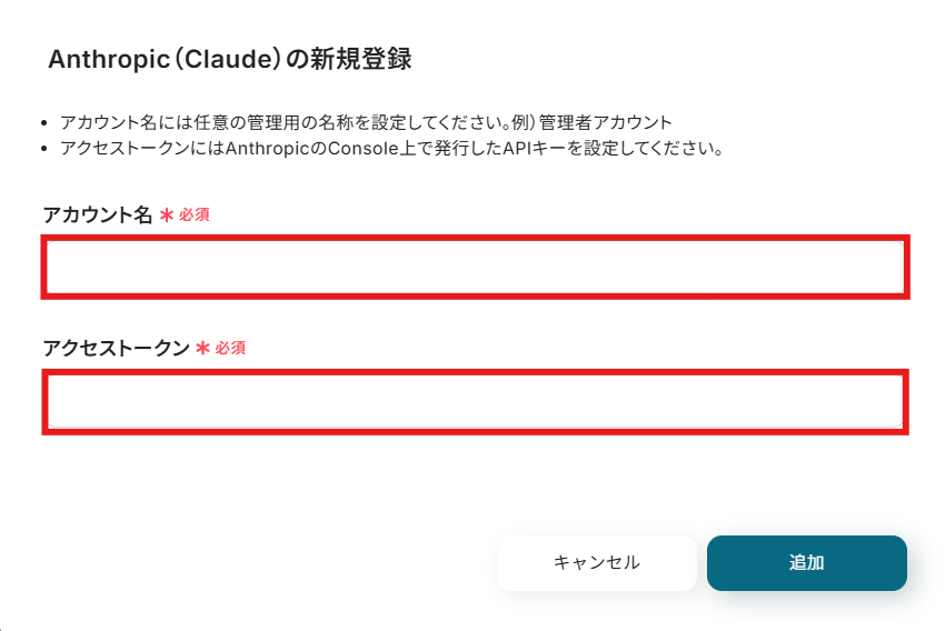 以下の画面が表示されるので、赤枠内を入力し「追加」をクリックします。