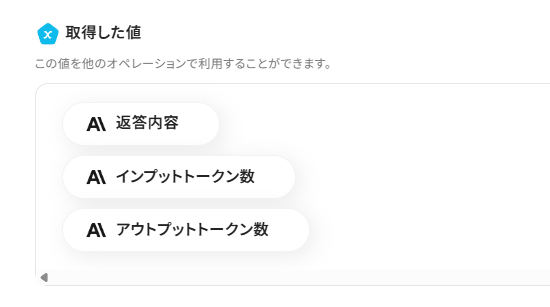 取得した値はアウトプットと呼びます。アウトプットは各アクションで取得でき、取得したアウトプットはそれ以降のアクションで活用可能です。