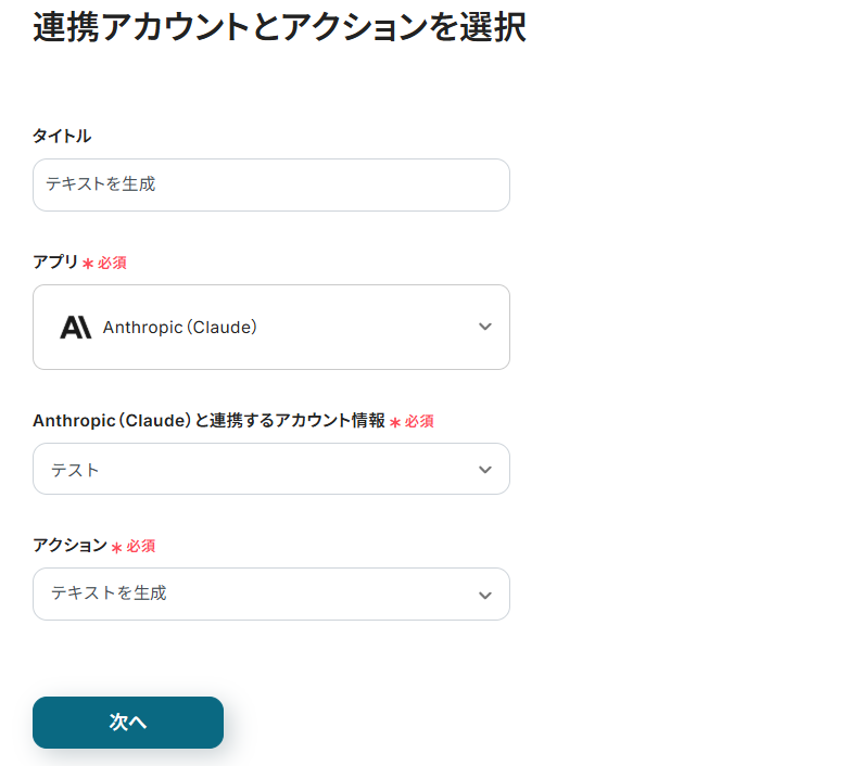 連携アカウントとアクションを選択する画面が表示されるので、今回連携するAnthropic(Claude)のアカウントを確認し「次へ」をクリックします。