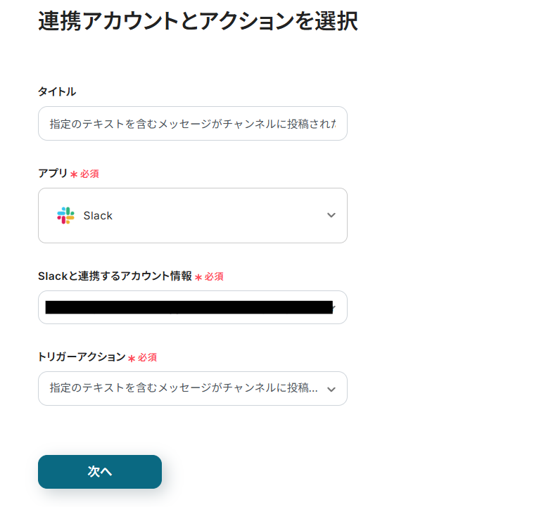連携アカウントとアクションを選択する画面が表示されるので、今回連携するSlackのアカウントを確認し「次へ」をクリックします。