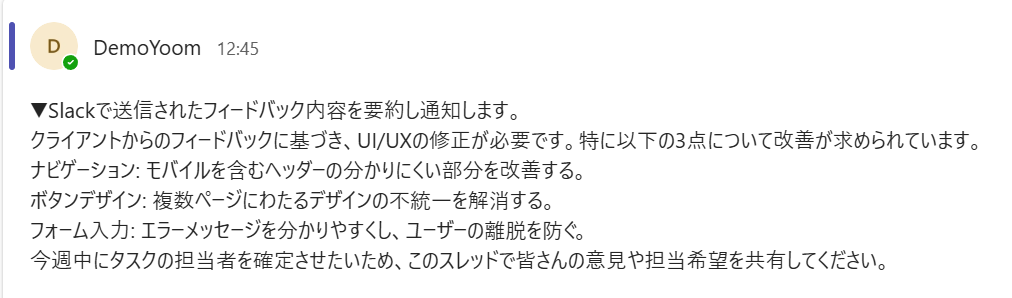 Slackの特定のチャンネルに投稿された長文のメッセージや議事録などを、Anthropic(Claude)が自動で要約し、その結果をMicrosoft Teamsの指定チャンネルに通知できます。