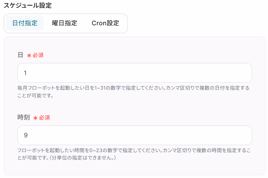 スケジュール設定は日付指定・曜日指定・Cron設定の3種類あります。