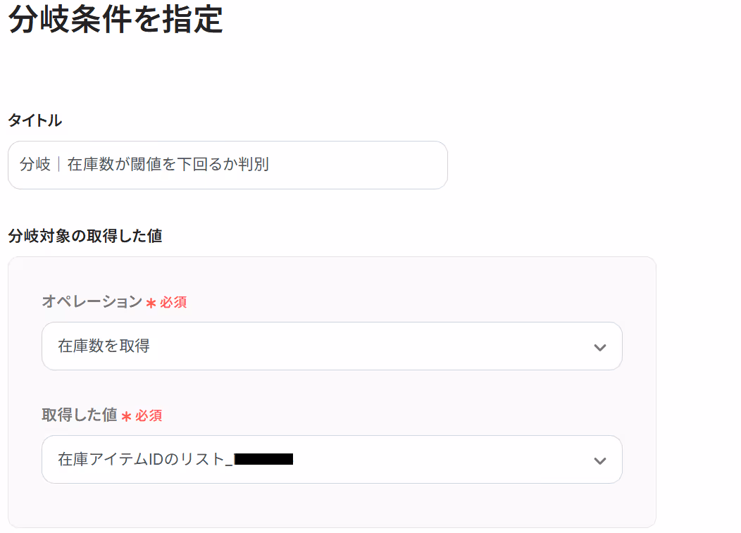 今回は、取得した値(在庫アイテムIDのリスト)が特定の数字(例として「10」)より小さい場合に次のステップに進むよう設定しています。