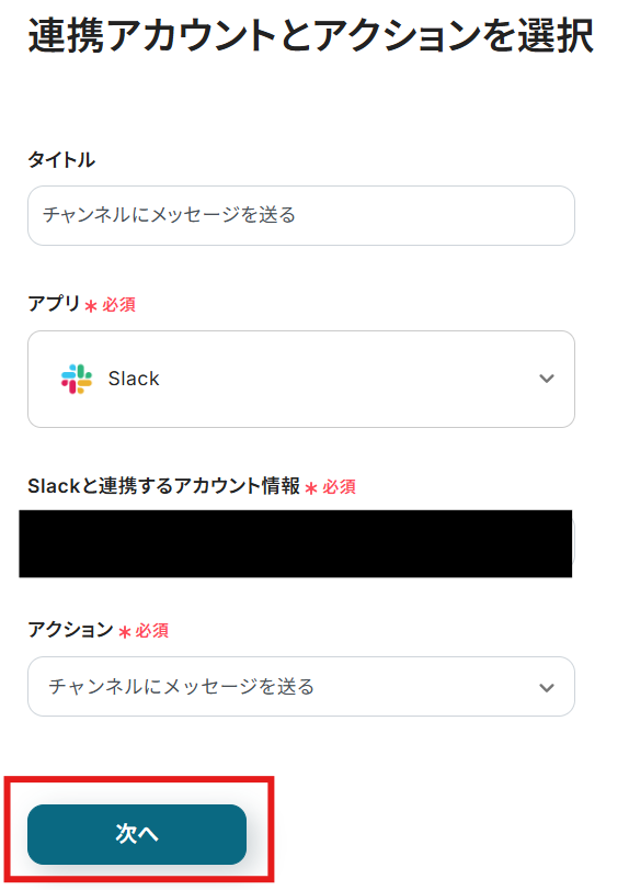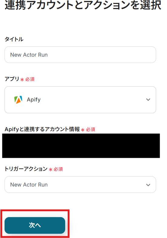 タイトルと連携するアカウント情報を確認し、アクションはテンプレート通りのまま「次へ」をクリックして進んでください。
