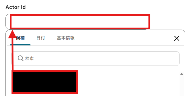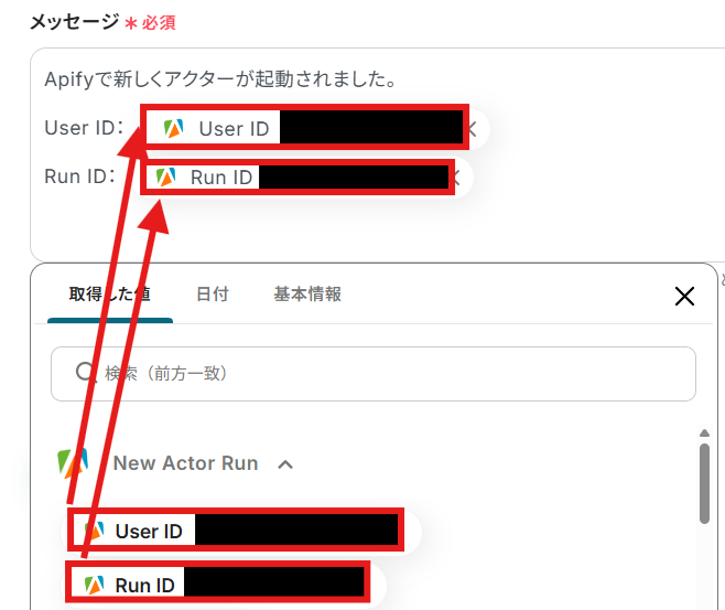 「Actor ID」「ActorTask ID」「ActorRun ID」のいずれかを以下のように候補から設定します。