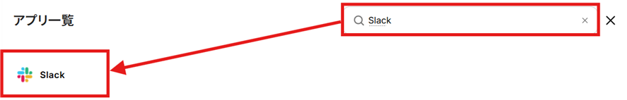 「アプリ一覧」が表示されるので、Slackを検索して選択しましょう。