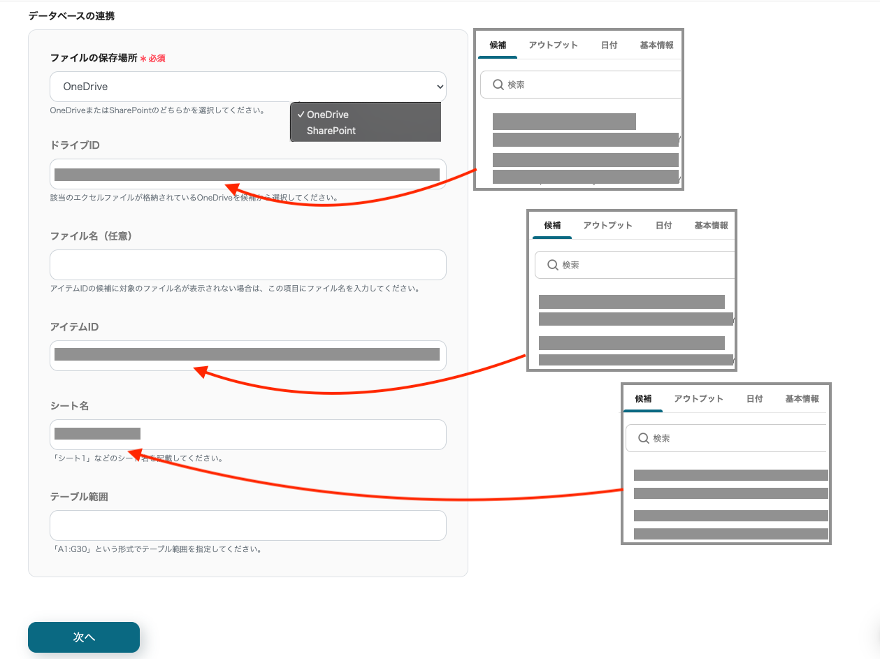 次に「ドライブID」を設定します。欄をクリックし表示される候補から選択できます。(SharePointを選択した場合は「サイトID」と表示されます)