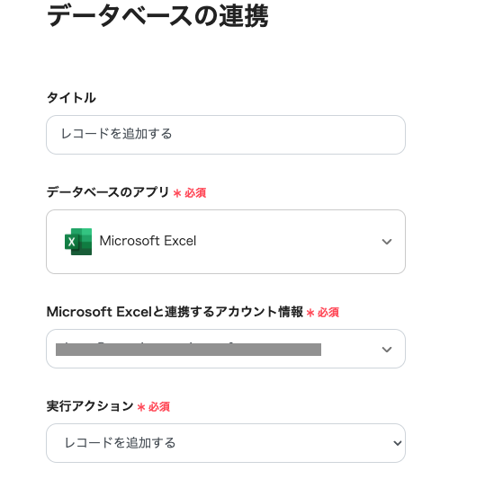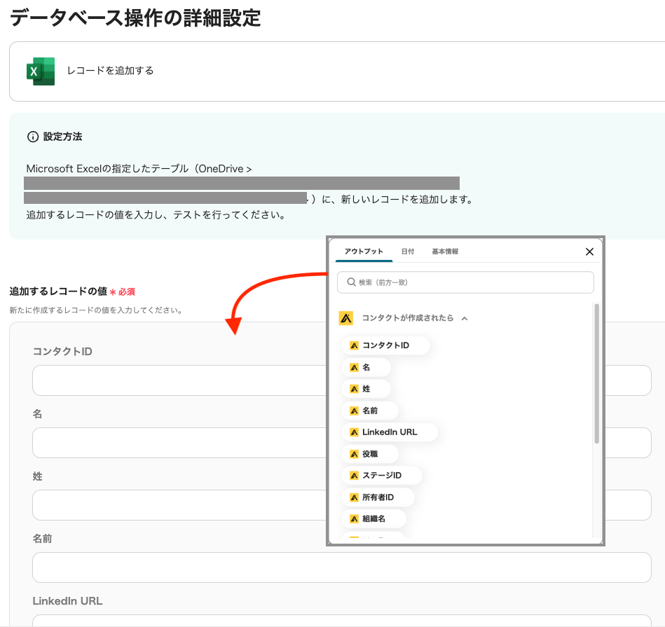 続いて、Microsoft Excelシートに追加するレコードの詳細設定を行います。