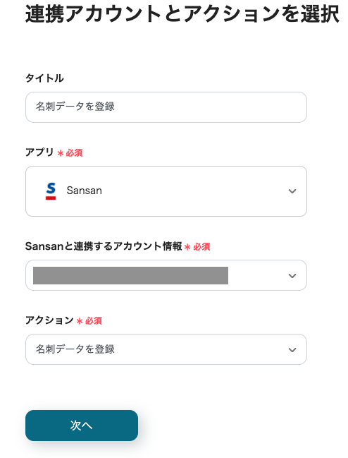 先ほどと同様にタイトルの任意編集とアカウント情報の確認を行い、アクションは変更せず「次へ」をクリックして先に進みましょう。