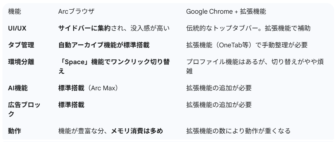 Chromeが「自分でカスタマイズして効率化する」ブラウザであるのに対し、Arcは「ブラウザ自体が最適な整理整頓を提案してくれる」という思想で作られています。特に、複数の役割やプロジェクトを同時に管理する必要がある方にとって、その真価を発揮するツールと言えるでしょう。