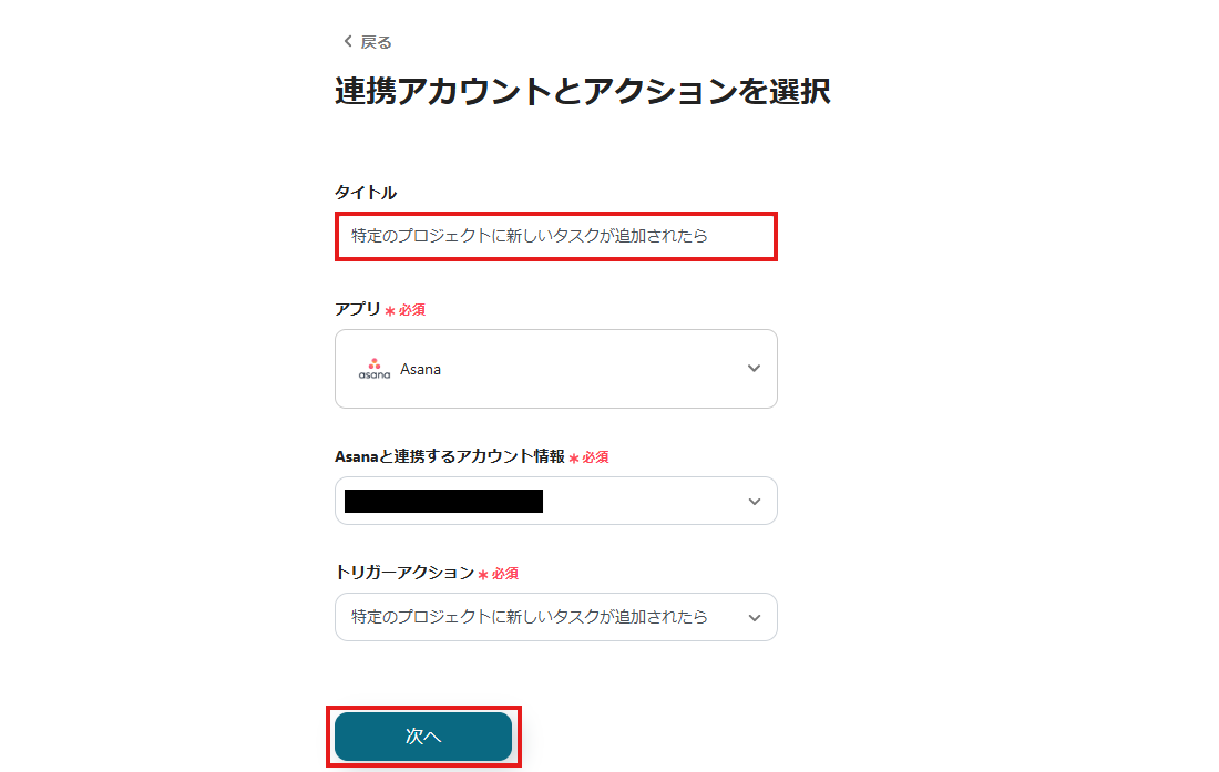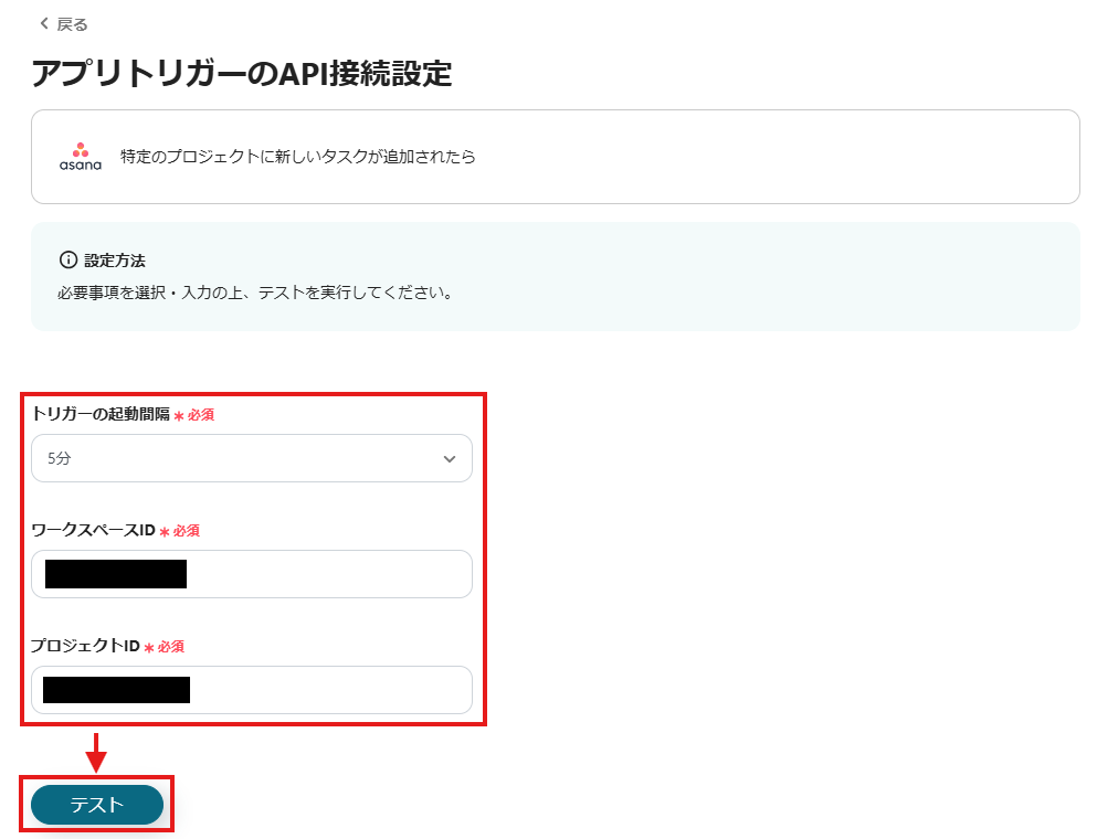 ステップ2: Asanaの特定のプロジェクトに新しいタスクが追加された時に起動するトリガーの設定