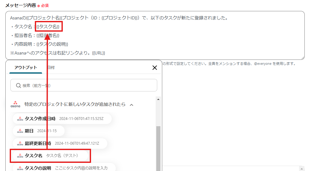 はい、できます。期日や担当者だけでなく、タスクの説明やタスクの作成日時などを追加できます。取得した値をDiscordに通知するメッセージに含めることで、タスク毎に変化する値となって通知が可能です。