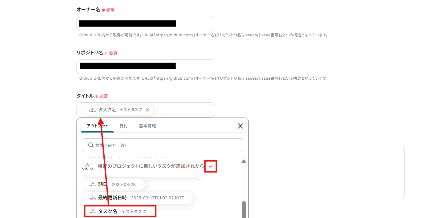 タイトルは入力欄をクリックすると以下の画像のようにAsanaから取得した情報が表示されるので、ぜひ活用してください!