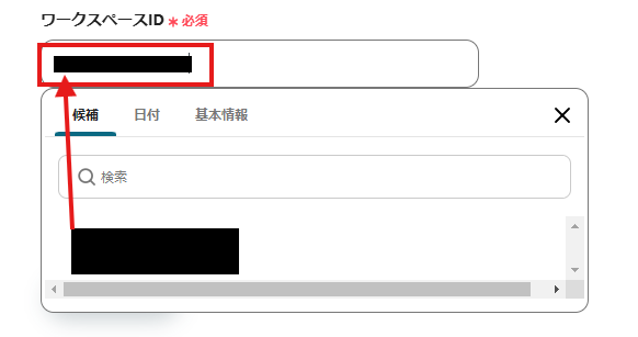 「ワークスペースID」は、入力欄をクリックして表示される候補から選択してください。